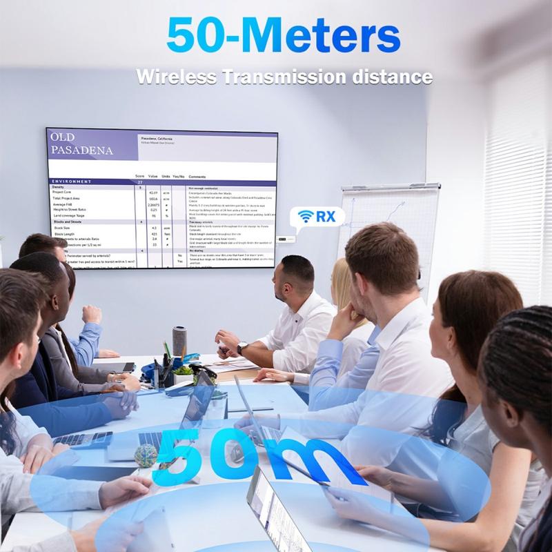Järjestelmä tukee jopa 1080P:n videolähetystä, mikä takaa terävän kuvanlaadun ja luotettavan suorituskyvyn näytöille, projektoreille ja monitoreille. Se on ihanteellinen ammattimaisiin esityksiin, videotoistoon ja näytön peilaamiseen.