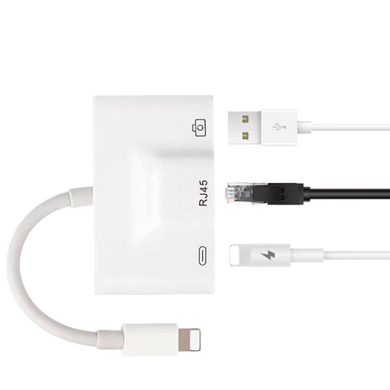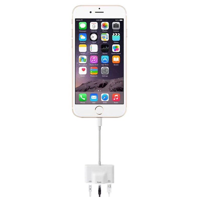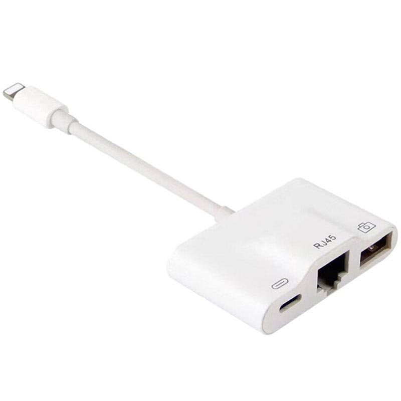 Tämä monitoiminen 3-in-1 - Lightning kaapelisovitin sisältää RJ45 Ethernet LAN -portin, USB 2.0 -portin ja 8-nastaisen lighting-portin, läpikulkuvirtauksella. Sovitin tukee 10/100 Mbps:n Internet-yhteyttä, ja se on yhteensopiva kaikkien 8-nastaisten Apple iPhonien ja iPadien kanssa, jotka toimivat iOS 10:ssa tai uudemmissa.