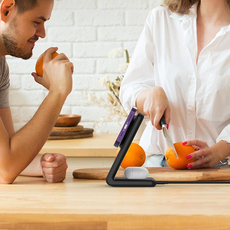 Käytä puhelintasi kädet vapaana latauksen aikana - ihanteellinen videopuheluita, sisällön katselua tai ilmoitusten lukemista varten. Ergonominen pystysuora muotoilu pitää näytön näkyvissä ja työtilan siistinä.