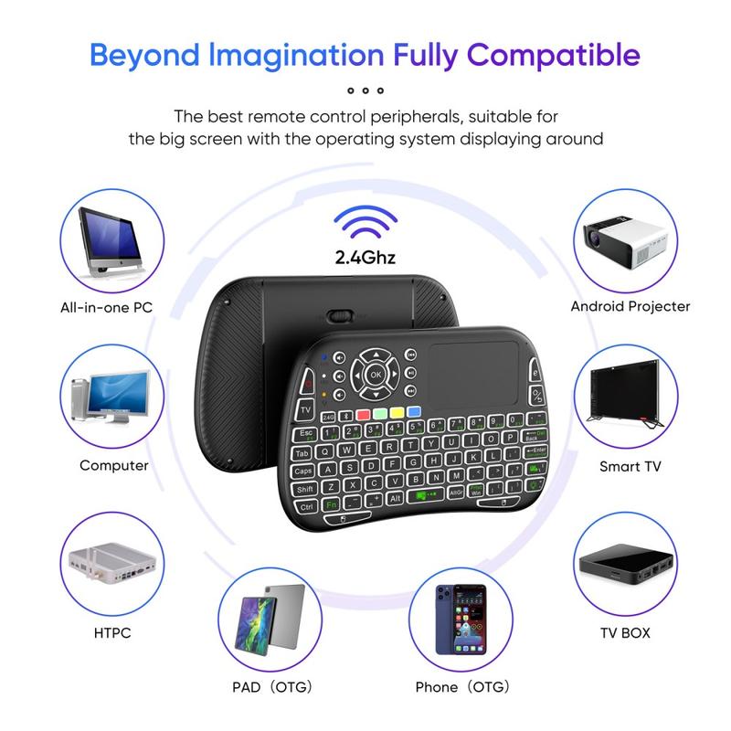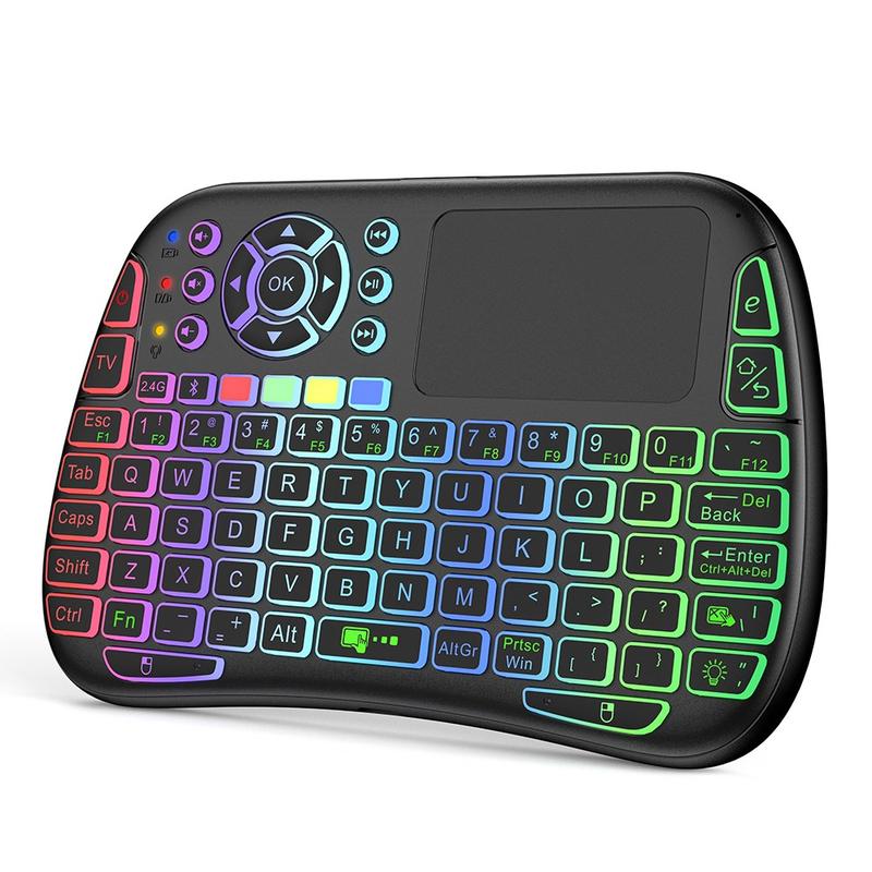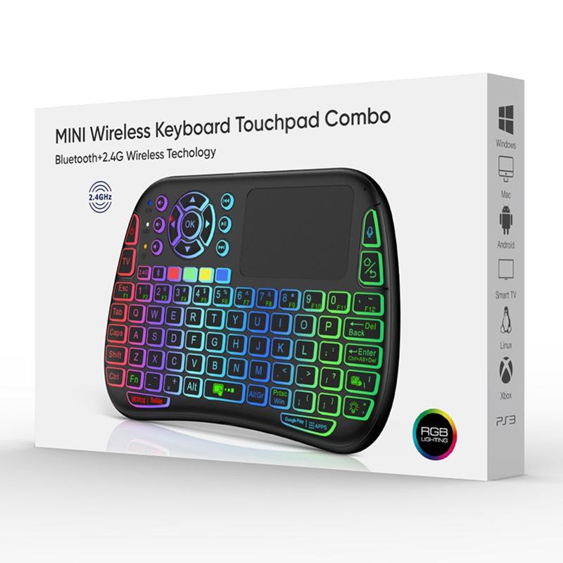 Näppäimistö tukee sekä 2,4 GHz:n langatonta yhteyttä USB-vastaanottimen kautta että Bluetooth 5.0 -yhteensopivuutta, mikä tarjoaa joustavuutta monien laitteiden, kuten älytelevisioiden, HTPC-järjestelmien, kannettavien tietokoneiden, tablettien ja Android-laitteiden, kanssa. Sisäänrakennettu kosketuslevy monikosketuseleillä korvaa hiiren, ja värikäs RGB-taustavalo helpottaa käyttöä myös pimeissä huoneissa.