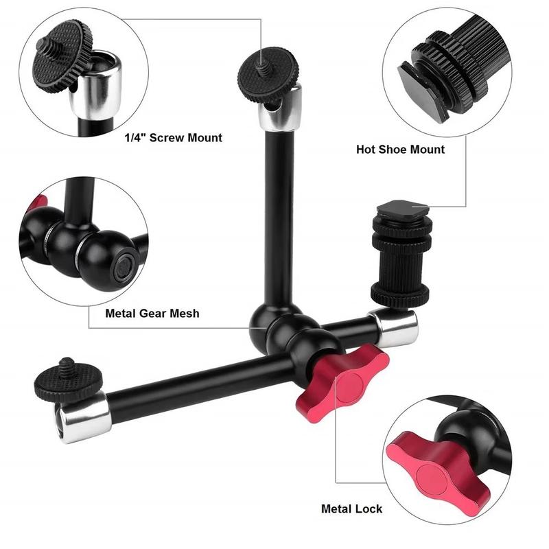 Alumiiniseoksesta ja ruostumattomasta teräksestä valmistettu kiinnike tarjoaa vahvan ja kestävän rakenteen, jossa on metallinen hammaspyörärakenne varmistamaan kiinnityksen. Kaikkien nivelten 360 asteen säätö helpottaa kulmien hienosäätöä, kun taas salamakenkä ja 1/4 tuuman kiinnitystuki takaavat laajan yhteensopivuuden DSLR-kameroiden ja niihin liittyvien lisälaitteiden kanssa. Punaiset pikakiinnityskahvat mahdollistavat nopean asennuksen ja uudelleenasennuksen ilman työkaluja, mikä auttaa virtaviivaistamaan työnkulkuasi kuvauksen aikana.