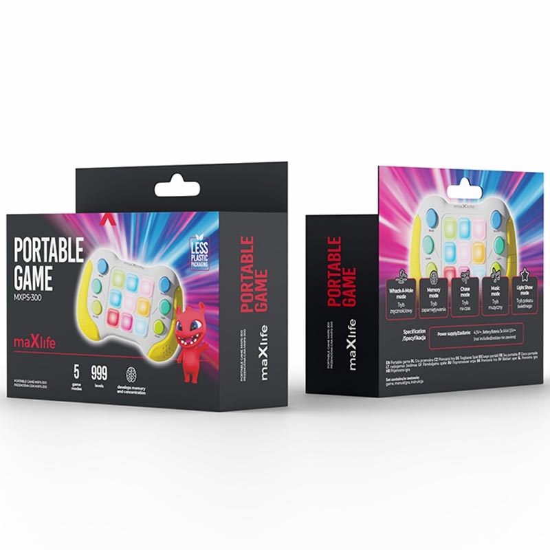 Maxlife MXPS-300 Electronic Push Game tuo modernin käänteen klassiseen kosketusleluun. Se on suunniteltu hauskanpitoa, keskittymistä ja koordinaatiota varten, ja se auttaa kaikenikäisiä pelaajia kehittämään refleksejä, muistia ja silmä-käsi-koordinaatiota dynaamisten valo- ja äänipohjaisten haasteiden avulla. Pienikokoinen ja kannettava peli mahtuu täydellisesti käteen ja on valmis pelaamaan missä ja milloin tahansa.