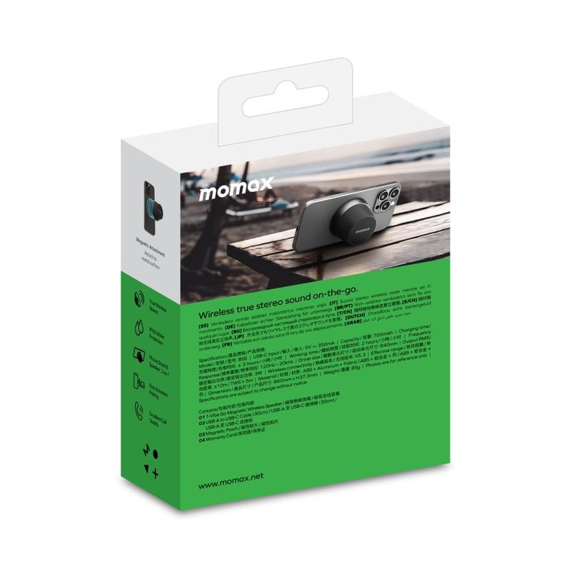 MOMAX 1-Vibe Go BS6 magneettinen mini-Bluetooth-kaiutin on kompakti, monipuolinen ääniratkaisu, joka on suunniteltu jokapäiväiseen viihdekäyttöön kotona tai matkoilla. Sen ultra-mini magneettinen muotoilu yhdistää kannettavan langattoman kaiuttimen ja käytännöllisen puhelintelineen, joten voit nauttia musiikista, videoista ja puheluista helposti. Varustettu tehokkaalla 40 mm:n kaiuttimella ja 360°:n äänentoistolla, se tarjoaa mukaansatempaavan äänen yllättävän pienessä muodossa, kun taas IPX6-vesitiiviys tekee siitä sopivan päivittäiseen käyttöön erilaisissa ympäristöissä.