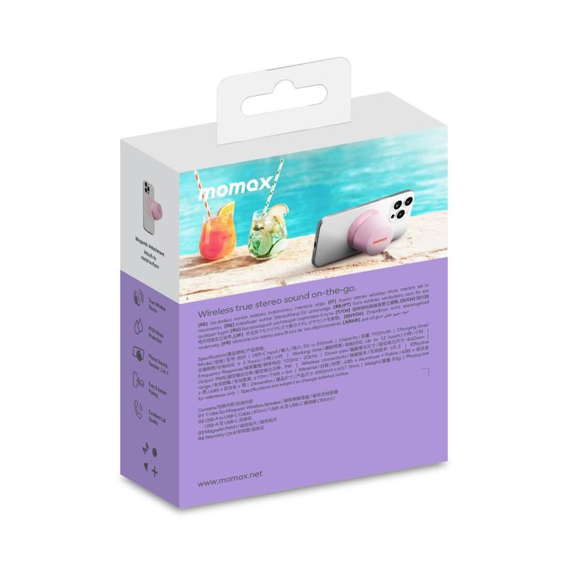 MOMAX 1-Vibe Go BS6 magneettinen mini-Bluetooth-kaiutin on kompakti ja monipuolinen ääniratkaisu, joka on suunniteltu päivittäiseen viihdekäyttöön kotona tai matkoilla. Sen ultra-mini magneettinen muotoilu yhdistää kannettavan langattoman kaiuttimen ja käytännöllisen puhelintelineen, joten voit nauttia musiikista, videoista ja puheluista helposti. Varustettuna tehokkaalla 40 mm:n kaiuttimella ja 360°:n äänentoistolla se tarjoaa vaikuttavan äänen yllättävän pienessä muodossa, kun taas IPX6-vesitiiviys tekee siitä sopivan päivittäiseen käyttöön erilaisissa ympäristöissä.