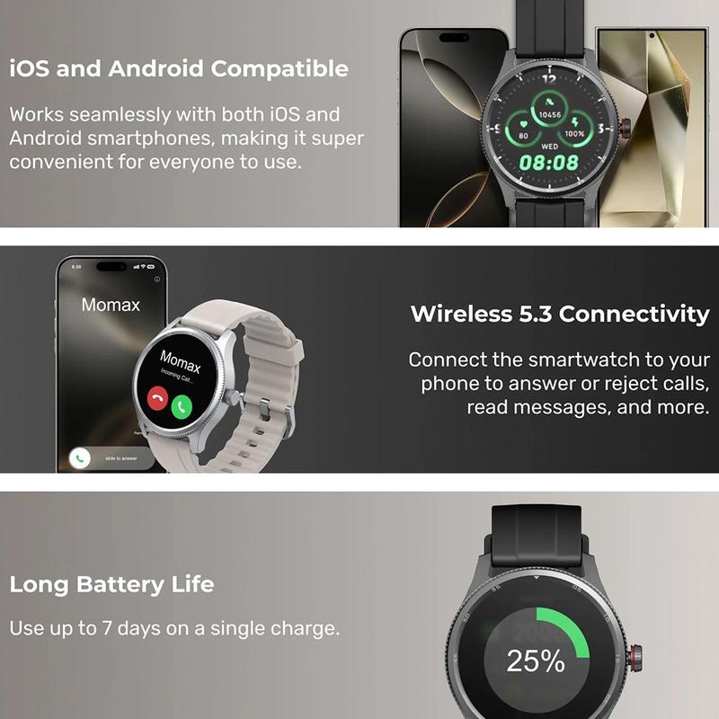 Pysy ajan tasalla päivästäsi MOMAX 1-Wear Smart Watch -kellolla - urheilullisella ja tyylikkäällä älykellolla, joka on suunniteltu päivittäiseen terveydentilan seurantaan ja aktiivisiin rutiineihin. Se seuraa sykettä, SpO2:ta (veren happipitoisuutta) ja stressiä, tarjoaa tekoälypohjaisen unen analysoinnin (mukaan lukien syvä uni ja REM-uni) ja seuraa treenejä yli 100 urheilutilassa. 1,38 tuuman pyöreä TFT-kosketusnäyttö on kirkas, helppokäyttöinen ja muokattavissa useilla kellotauluilla, joten se näyttää yhtä hyvältä töissä kuin treenissäkin. IP68-vesitiiviys, Wireless 5.3 -yhteys ja jopa 7 päivän akunkesto takaavat mukavuuden aamusta iltaan.