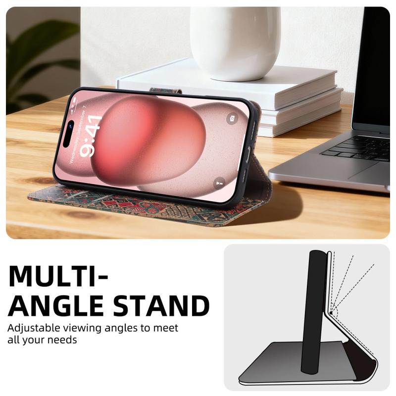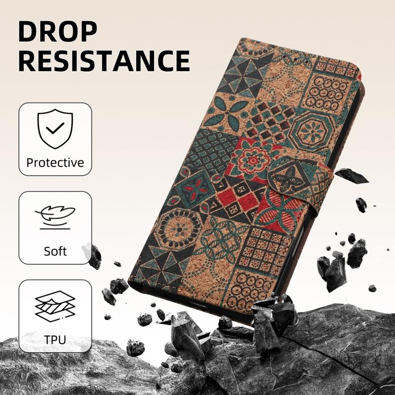 Tämä laukku tarjoaa täydellisen tasapainon tyylin, suojan ja organisoinnin välillä. Taiteellisen muotoilun, lompakkotoiminnallisuuden ja jalustaominaisuuden ansiosta se on ihanteellinen käyttäjille, jotka haluavat puhelimensa kotelon olevan sekä käytännöllinen että visuaalisesti erottuva.