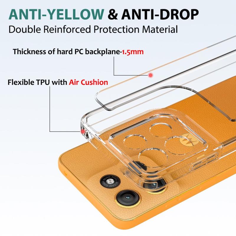 Tämä lisälaite käyttää akryylin ja TPU:n yhdistelmää älypuhelimen pitämiseksi suorastaan neitseellisessä kunnossa. Lisäksi sen vahvistetut, iskuja vaimentavat kulmat estävät pudotusvaurioita, kun taas läpinäkyvä malli esittelee Motorola Moto G17 Power, Moto G17, Moto G15:n upeaa suunnittelua.