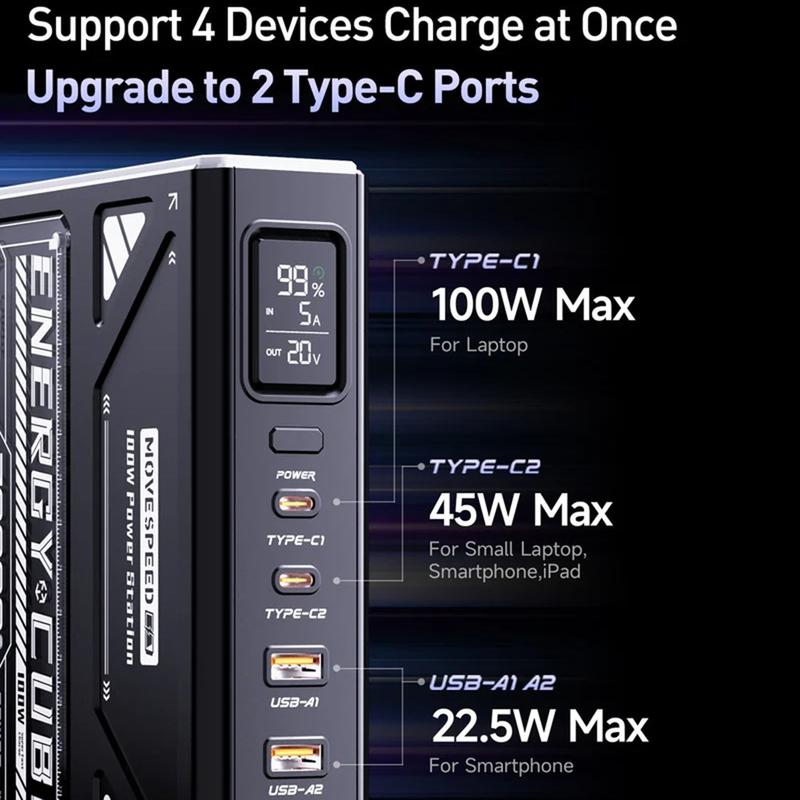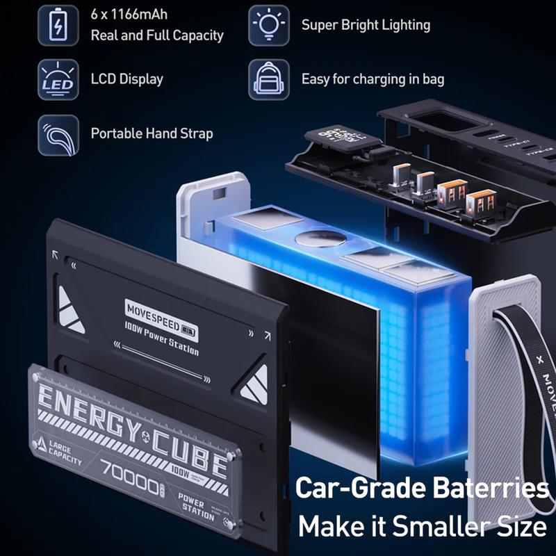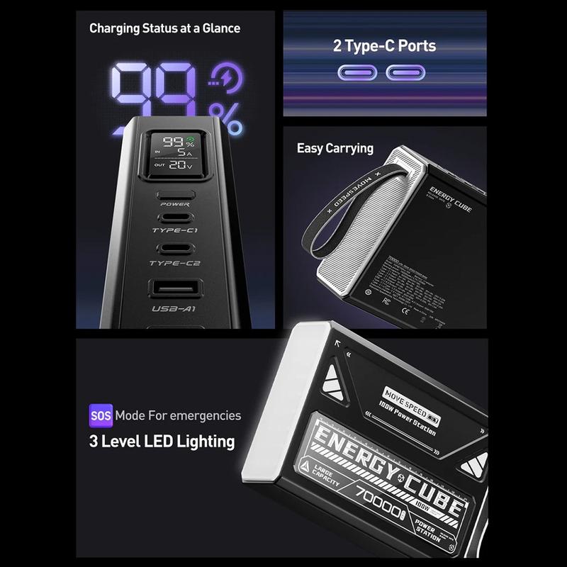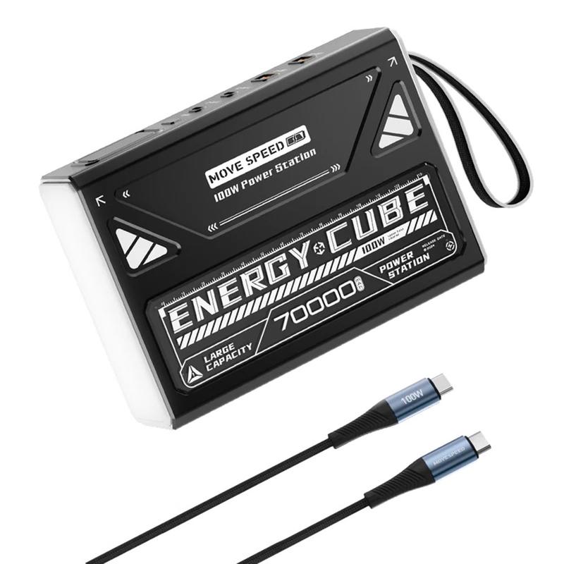 MOVESPEED YSPBZ70Pro-100 -virtapankki pitää kaikki laitteesi virtalähteenä päivien ajan, sillä sen kapasiteetti ja suorituskyky ovat huippuluokkaa. Valtava 70000 mAh:n akku, 100 W PD-pikalataus ja kestävä, kannettava muotoilu tekevät siitä täydellisen matkoille, ulkotöihin ja hätävaravirtakäyttöön.