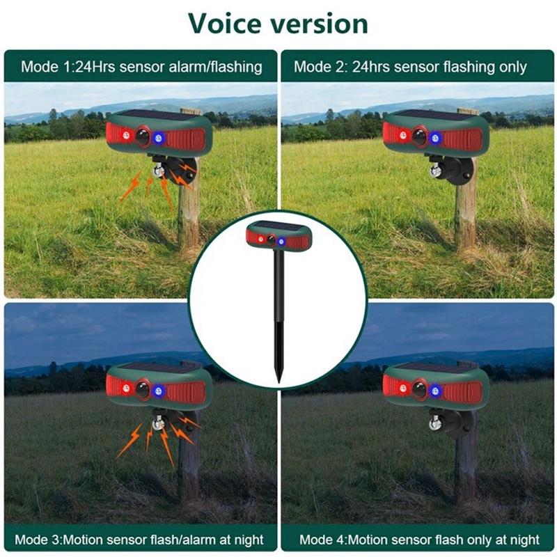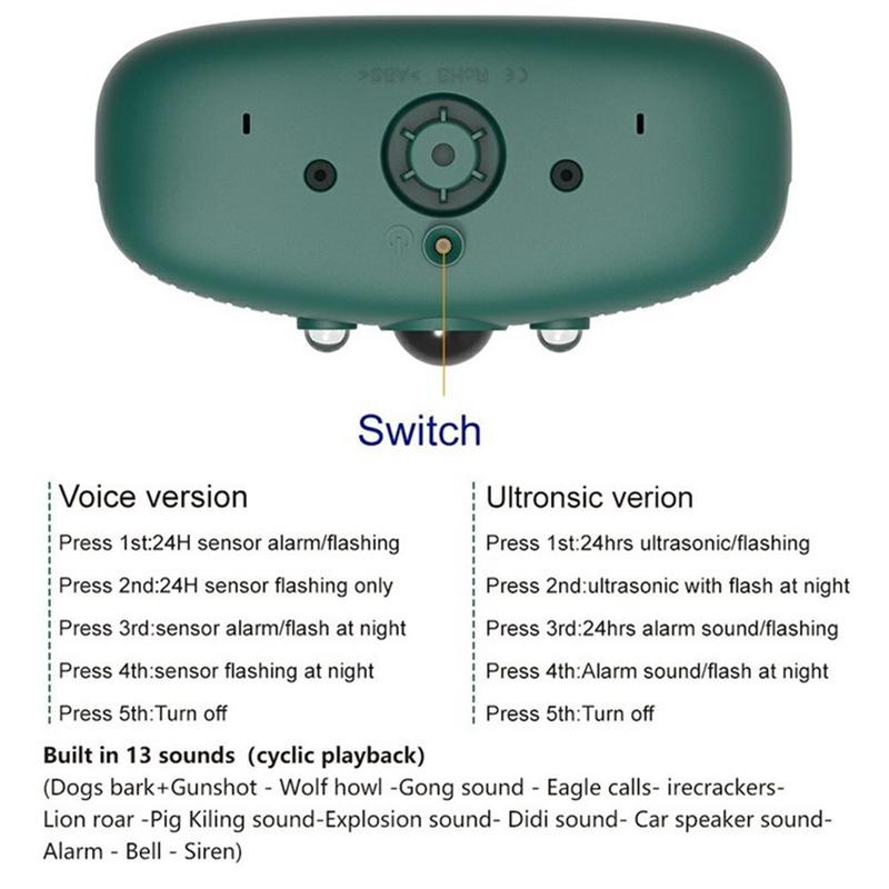 Tässä laitteessa on 12 pyörivää äänitehostetta, mukaan lukien sireenit, koiran haukahdukset ja laukaustyyliset äänet, ja se tarjoaa monipuolisen pelotusratkaisun eläinten ja tuholaisten pitämiseksi poissa kiinteistöstäsi.