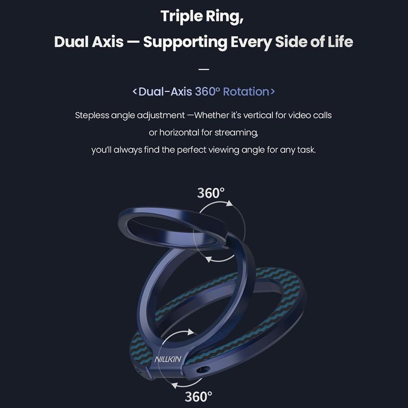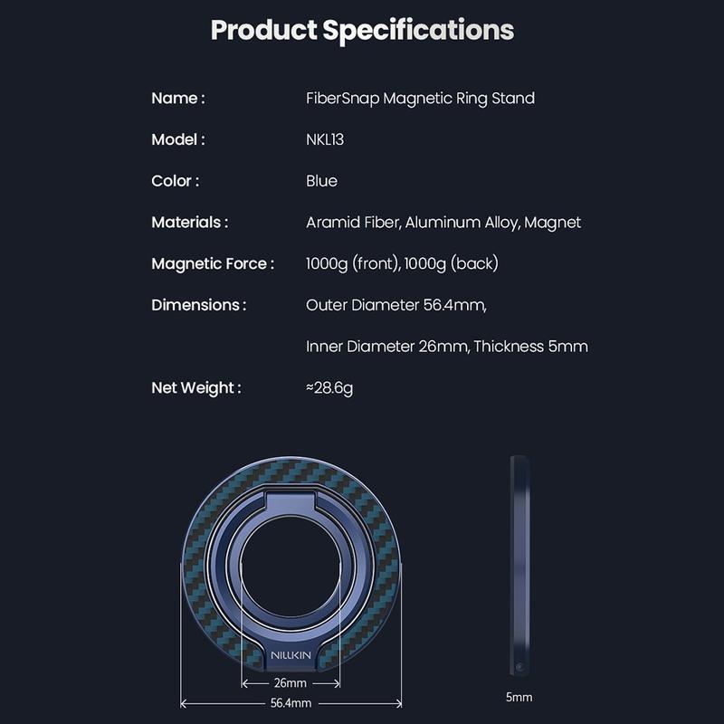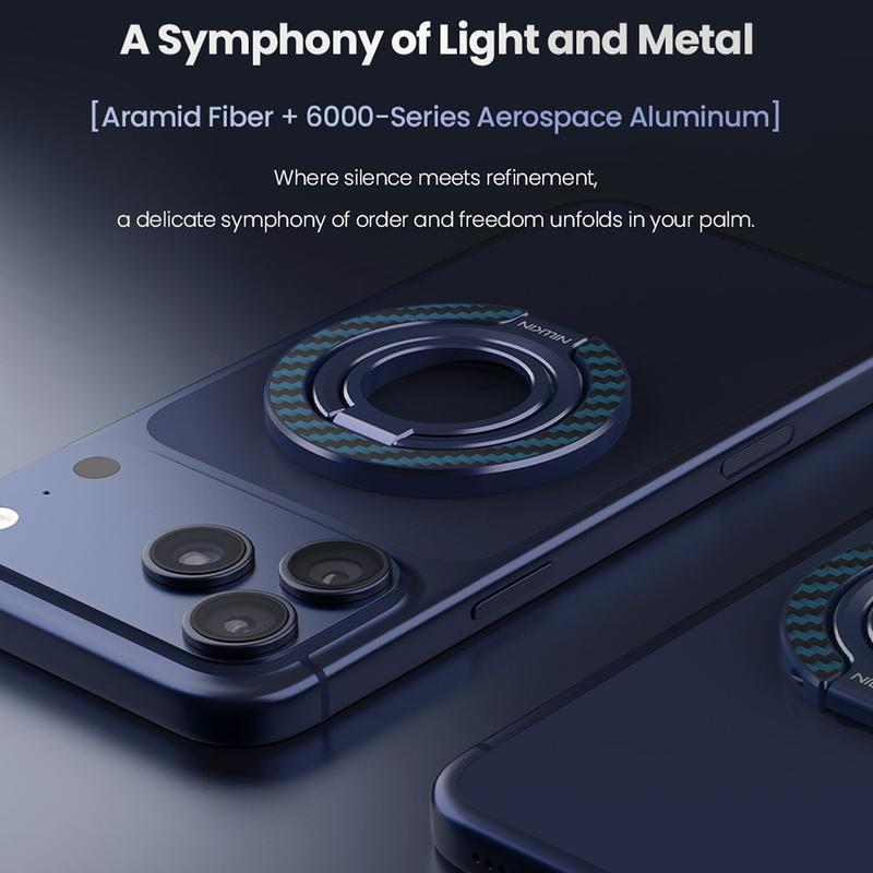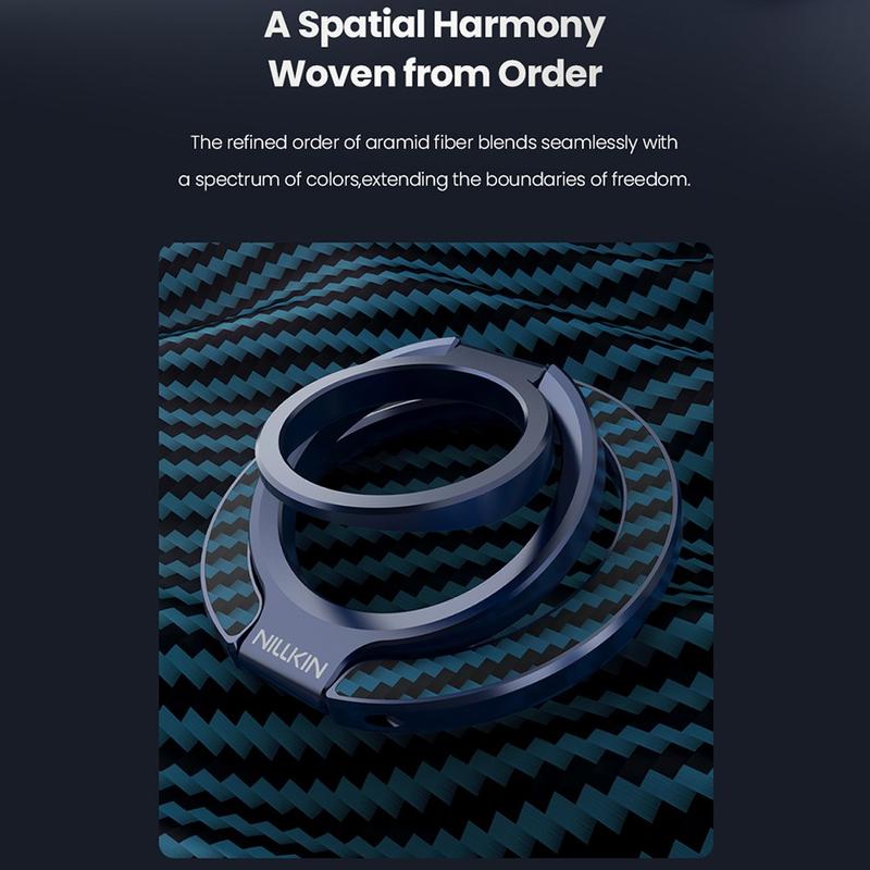 Nillkin FiberSnap Magneettinen rengastelineessä yhdistyvät ensiluokkaiset materiaalit ja joustavat toiminnot, jotka parantavat puhelimen jokapäiväistä käyttöä. Se on valmistettu kevyestä aramidikuidusta ja anodisoidusta alumiinista, ja se tarjoaa hienostuneen teknisen estetiikan sekä turvallisen otteen ja vaivattoman handsfree-katselun. Se on suunniteltu saumattomaan MagSafe-käyttöön, joten se mukautuu sujuvasti työhön, matkustamiseen ja jokapäiväiseen elämään olematta tiellä.