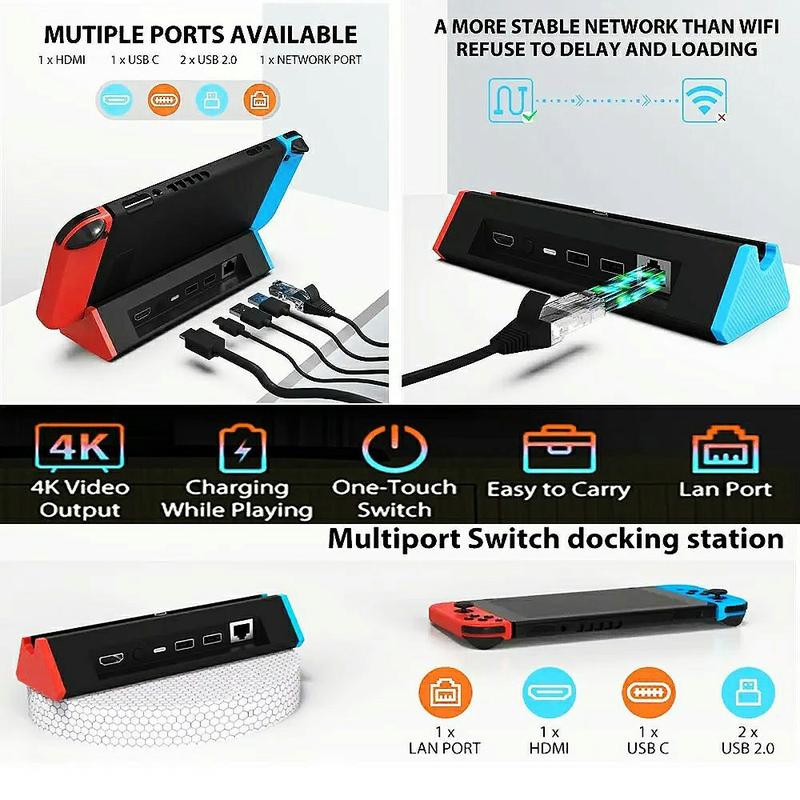 Päivitä peliasennustasi Nintendo Switch 2 -telakointiasemalla, joka on suunniteltu upeaan visuaaliseen näyttävyyteen ja monipuoliseen liitettävyyteen. Tämä telakka tukee jopa 4K-tulostusta 120 Hz:n taajuudella ja takaa sujuvan, teräväpiirtopelaamisen yhteensopivilla näytöillä. Sisäänrakennettujen HDMI 2.1-, USB 3.0-, Type-C- ja RJ45-porttien ansiosta se tarjoaa täydellisen keskittimen pelaamiseen, suoratoistoon ja nopeisiin verkkoyhteyksiin. Kompaktin ja kannettavan rakenteensa ansiosta se sopii täydellisesti sekä kotiasetuksiin että matkoille, ja se tarjoaa parhaan mahdollisen yhdistelmän suorituskykyä ja mukavuutta.