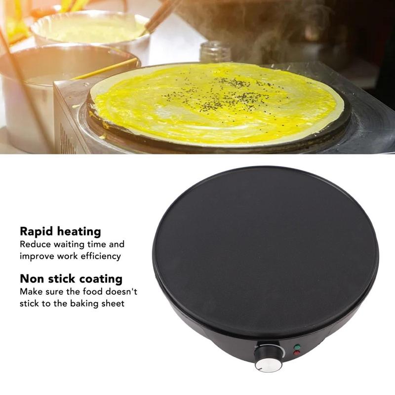 Luo täydellisen ohuita, tasaisesti kypsennettyjä kreppejä kotona tai ammattikeittiöissä tällä 12-tuumaisella sähköisellä kreppikoneella. Laitteessa on leveä tarttumaton alumiininen keittolevy ja älykäs lämpötilan säätö, joka takaa tasaisen lämmityksen ja tasaiset tulokset joka kerta. Nopeasti lämpenevä 1000 W:n muotoilu säästää sekä aikaa että energiaa, joten voit valmistaa crepejä, pannukakkuja, lättyjä ja erilaisia ohuita leivonnaisia helposti. BPA-vapaa rakenne, yksinkertainen käyttö ja helposti puhdistettava pinta tekevät siitä käytännöllisen ja käyttäjäystävällisen lisän mihin tahansa keittiöön.