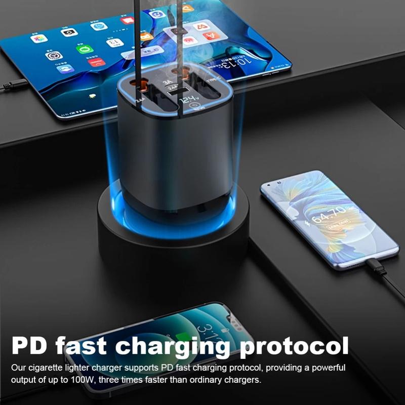 PT-17 autolaturi - 100W PD-pikalataussovitin, jossa on sisäänvedettävät Lightning/Type-C-kaapelit, jännitteen näyttö ja sisäänrakennettu ilmanraikastin