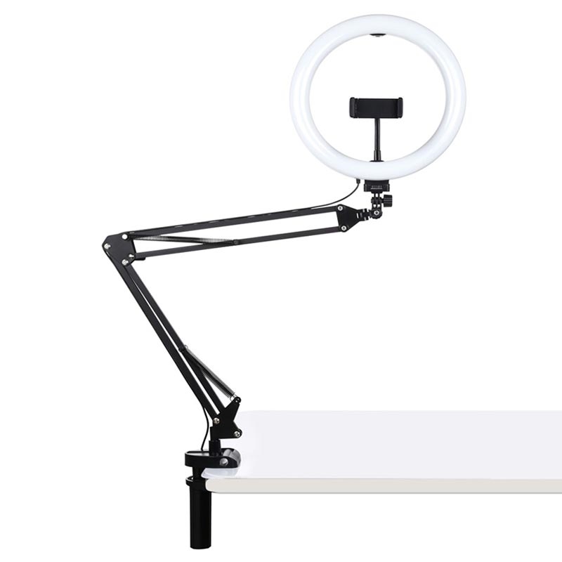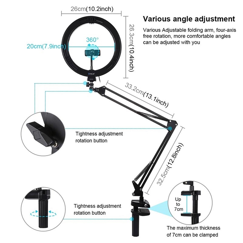 PULUZ 10.2" 26cm rengas kaareva valo + työpöydän käsivarsijalusta USB 3 moodit himmennettävä Dual värilämpötila LED Vlogging Selfie valokuvaus video valot puhelimen kiinnittimellä
