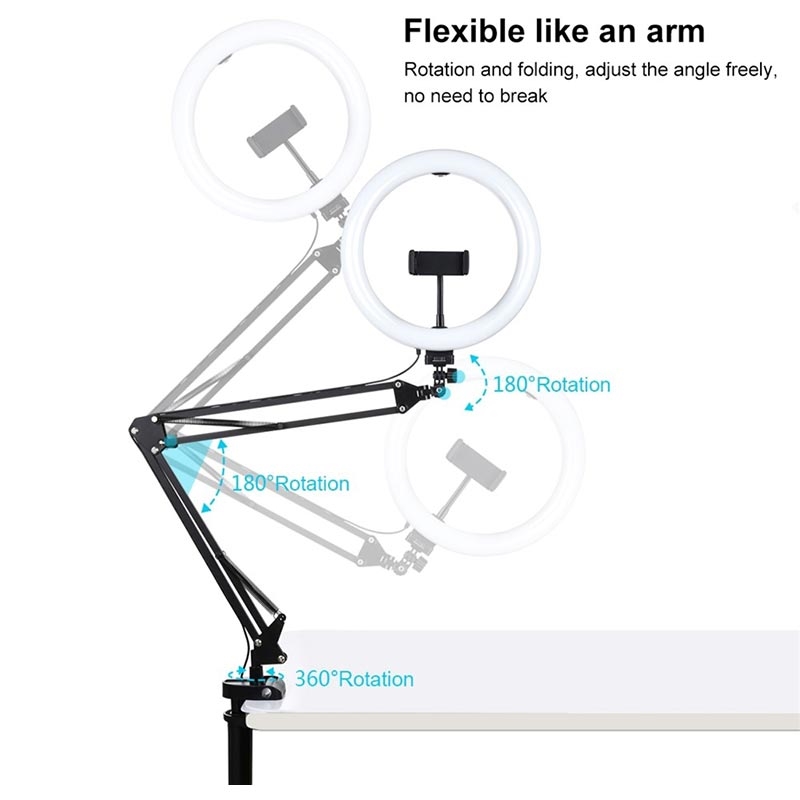 LED-rengasvalo voidaan asentaa pidikkeeseen ja ottaa se minne tahansa, se voidaan myös poistaa jalustasta milloin tahansa, jalustan pallopää voi 360 astetta pyörivä voi vapaasti säätää mihin tahansa kulmaan (pidike ei sisälly).)