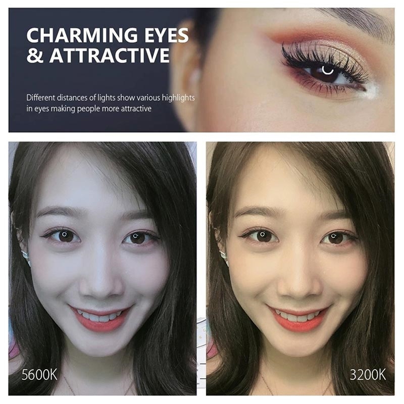 3 väriä valaistustila säädettävä kirkkaus valintasi varten, voit säätää väriä ja kirkkautta erittäin helposti, hyvä kirkkaus voidaan saavuttaa ilman ylimääräisten värillisten suodattimien asentamista. Kolme väriä pehmeää luonnonvaloa valaisee kauneutesi eri tilaisuuksissa