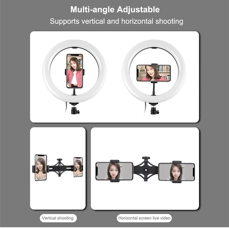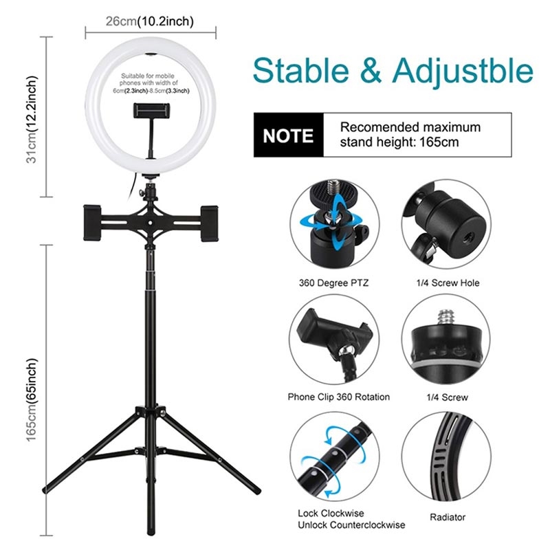 LED-rengasvalo voidaan asentaa pidikkeeseen ja ottaa se minne tahansa, se voidaan myös poistaa jalustasta milloin tahansa, jalustan pallopää voi 360 astetta pyörivä voi vapaasti säätää mihin tahansa kulmaan