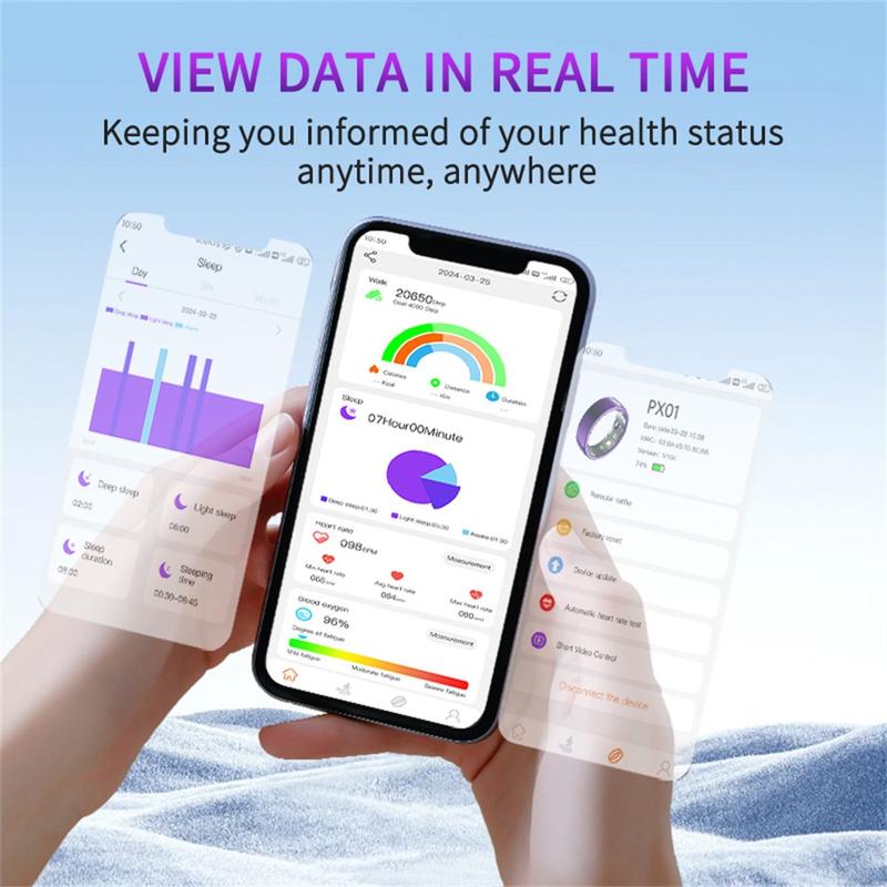 PX01 Smart Ring on erittäin kevyt hyvinvoinnin seurantajärjestelmä, joka on suunniteltu jatkuvaan terveyden seurantaan. Automaattisen sykkeen, unen, stressin ja veren hapen seurannan ansiosta se tarjoaa reaaliaikaista tietoa yleisestä hyvinvoinnistasi. Tässä sormuksessa on IP68-vedenpitävyys ja langaton latausalusta, ja se on rakennettu mukavuutta, kestävyyttä ja mukavuutta varten.