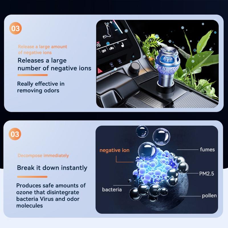 Q1-auton ilmanpuhdistin-ionisaattori on hiljainen 12 V:n auton ilmanraikastin, joka on suunniteltu vähentämään savuhajua ja ei-toivottuja hajuja sekä tuomaan sisätilaan pehmeän sinisen yövalon. 720 asteen puhdistusalueella, suurella negatiivisten ionien tuotolla, alhaisella virrankulutuksella ja kompaktilla alumiiniseosrakenteella se on käytännöllinen lisävaruste, joka pitää auton matkustamon raikkaampana ja mukavampana.