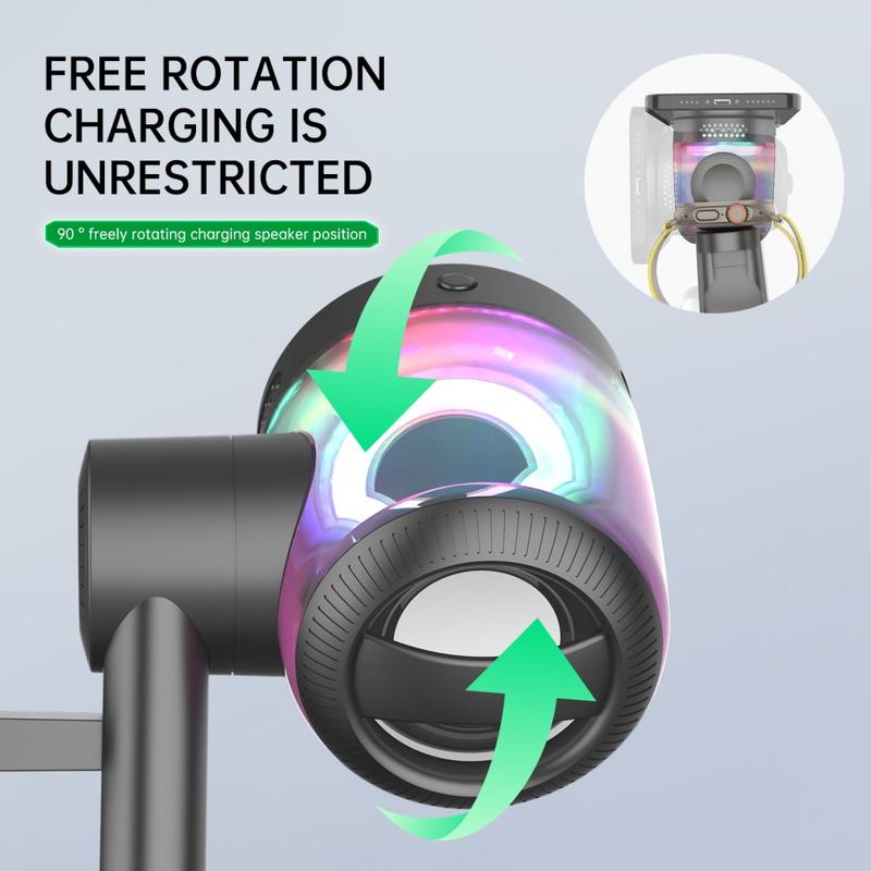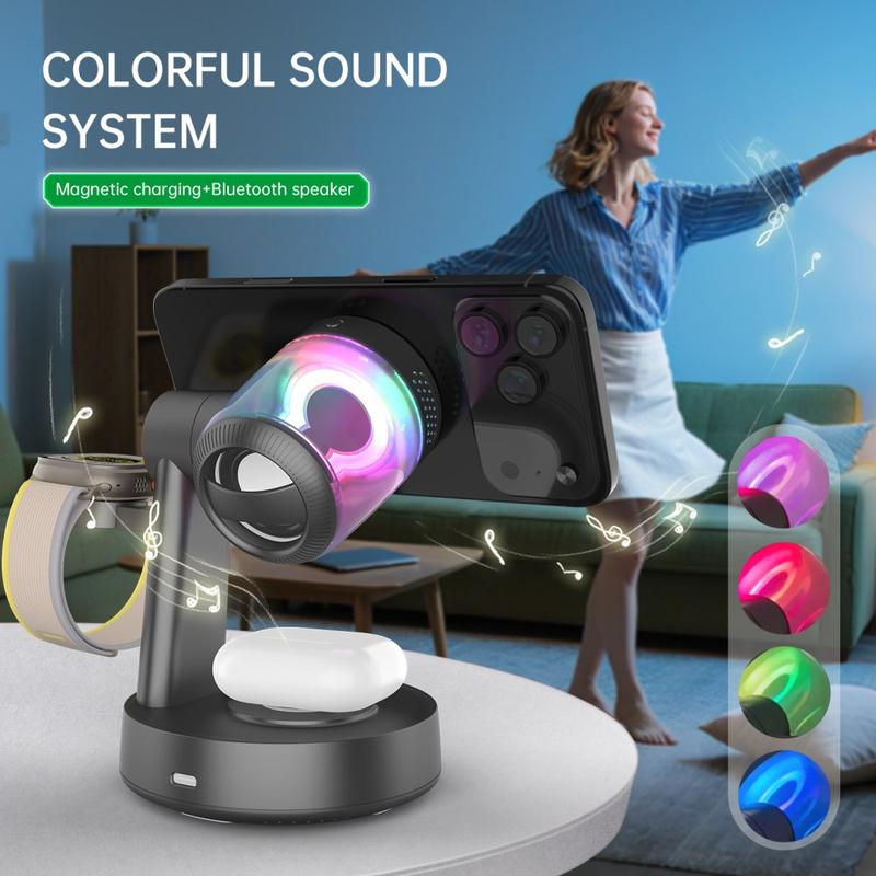 QI2.2-magneettisen langattoman latausaseman avulla voit poistaa kaapelisotkun ja syöttää virtaa kaikkiin tärkeimpiin tarvikkeisiisi yhdessä paikassa. Se on suunniteltu moderneihin työpöytiin ja yöpöytiin, ja siinä yhdistyvät 25W:n magneettinen langaton laturi, Bluetooth-kaiutin ja RGB-ympäristövalaistus, mikä luo täydellisen monikäyttöisen latausratkaisun puhelimelle, kuulokkeille ja älykellolle.