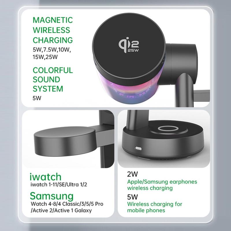 QI2.2 25W magneettinen langaton latausasema Bluetooth-kaiuttimella ja RGB-valaistuksella - 3-in-1-latauslaite puhelimelle, kuulokkeille ja älykellolle.
