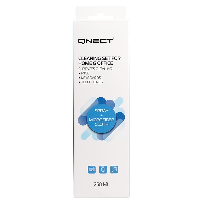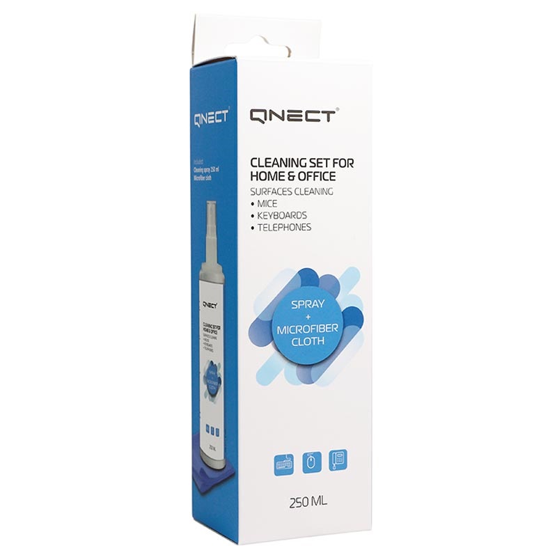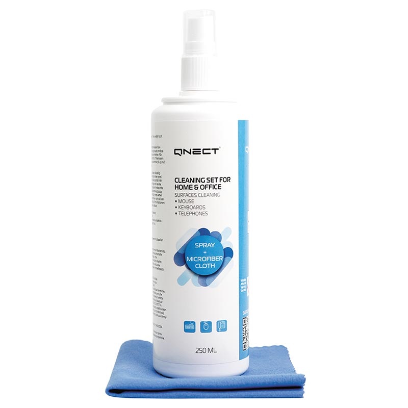 - The Qnect office/home cleaning set combines a soft cloth and 250ml disinfectant spray