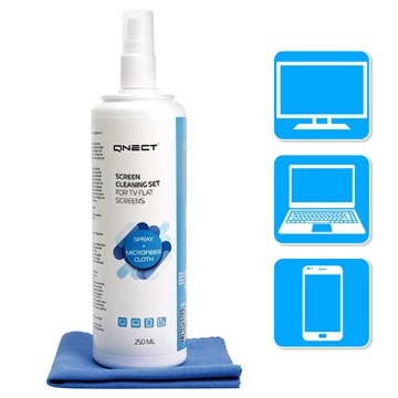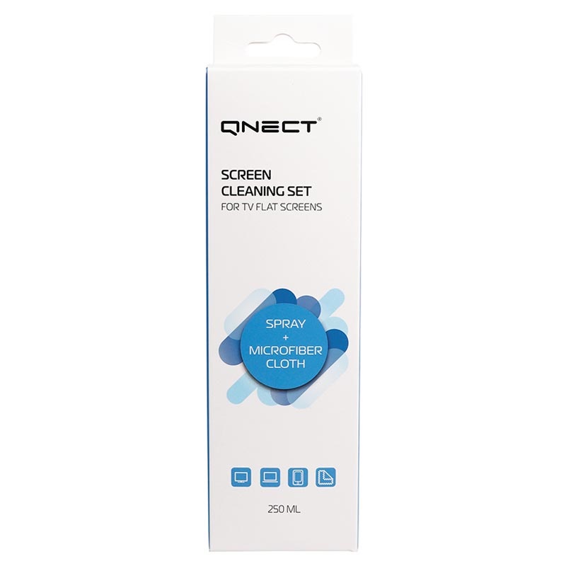 - The Qnect screen cleaning set combines 250ml disinfectant spray and a soft cloth