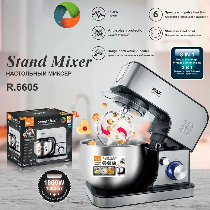 Automaattinen taikinasekoitin RAF R6605 on tehokas ja monipuolinen keittiökone, joka on suunniteltu helpottamaan jokapäiväistä ruoanlaittoa ja leivontaa. Vankan 1800 W:n moottorin, suuren 5 litran ruostumattomasta teräksestä valmistetun kulhon ja useiden sekoituslisälaitteiden ansiosta se hoitaa vaivaus-, sekoitus-, vatkaus- ja sekoitustyöt helposti monenlaisten reseptien valmistuksessa.
