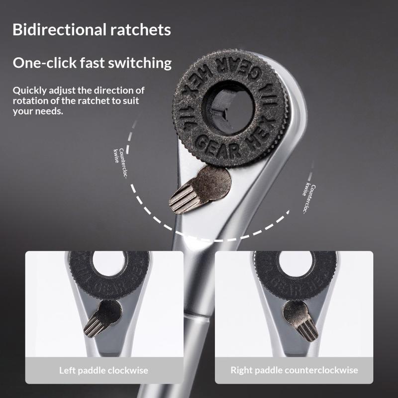Rockbros TG-8601:ssä on innovatiivinen kaksisuuntainen räikkämekanismi, jonka avulla voit kiristää tai löysätä kiinnikkeitä sujuvasti ilman työkalun uudelleenasettamista, mikä säästää aikaa ja vaivaa pyörän huollossa.