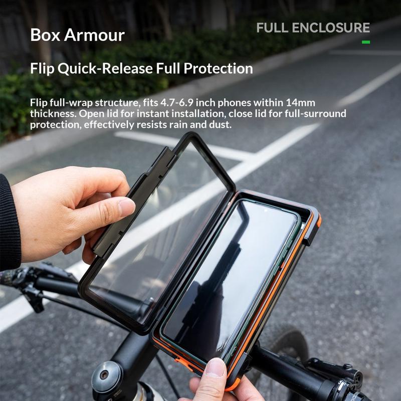 Tämä ROCKBROS-teline on fiksu valinta, jos haluat sääsuojan ja nopean magneettisen kiinnityksen. Se pitää puhelimesi turvallisemmin paikallaan, parantaa näkyvyyttä täyden kiertoliikkeen ansiosta ja mahdollistaa lataamisen ja kameran käytön ilman, että laitetta tarvitsee irrottaa. Ihanteellinen pyöräilijöille, jotka haluavat mukavuutta suojaavuudesta tinkimättä.