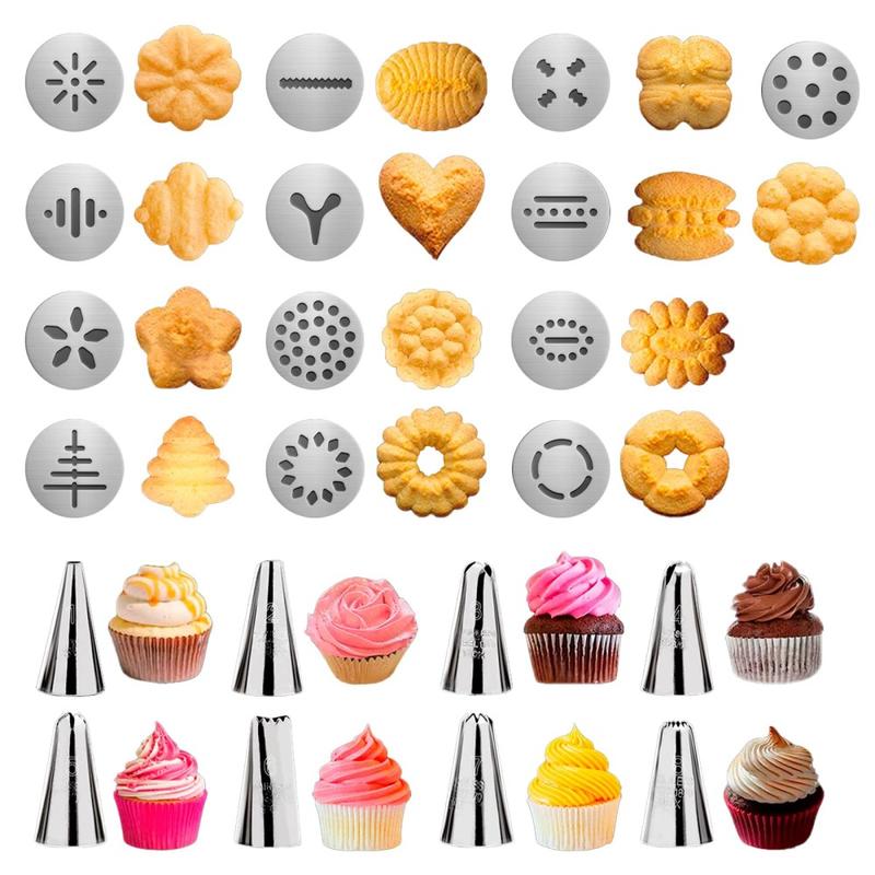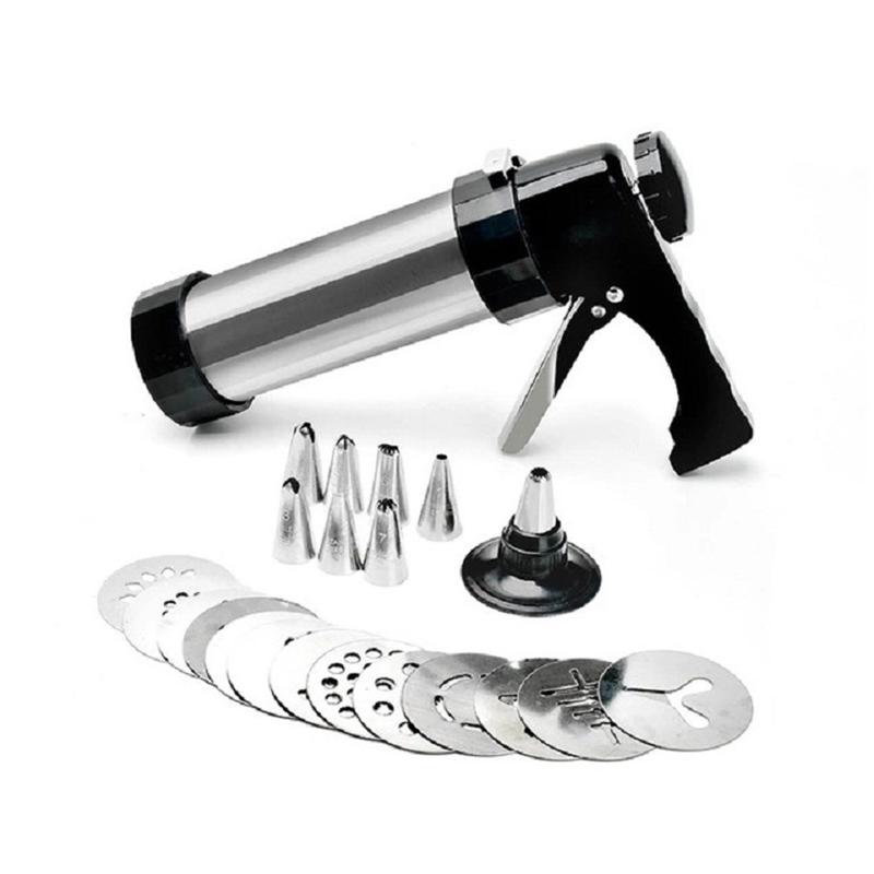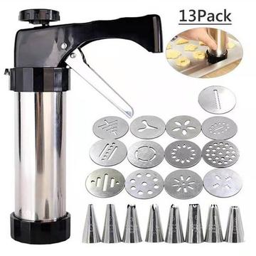 - Täydellinen leivontasetti, jossa on 1 keksipuristinpistooli, 13 keksilevyä ja 8 pursotussuutinta