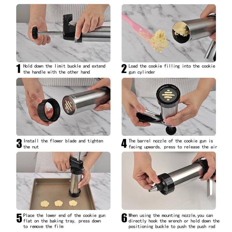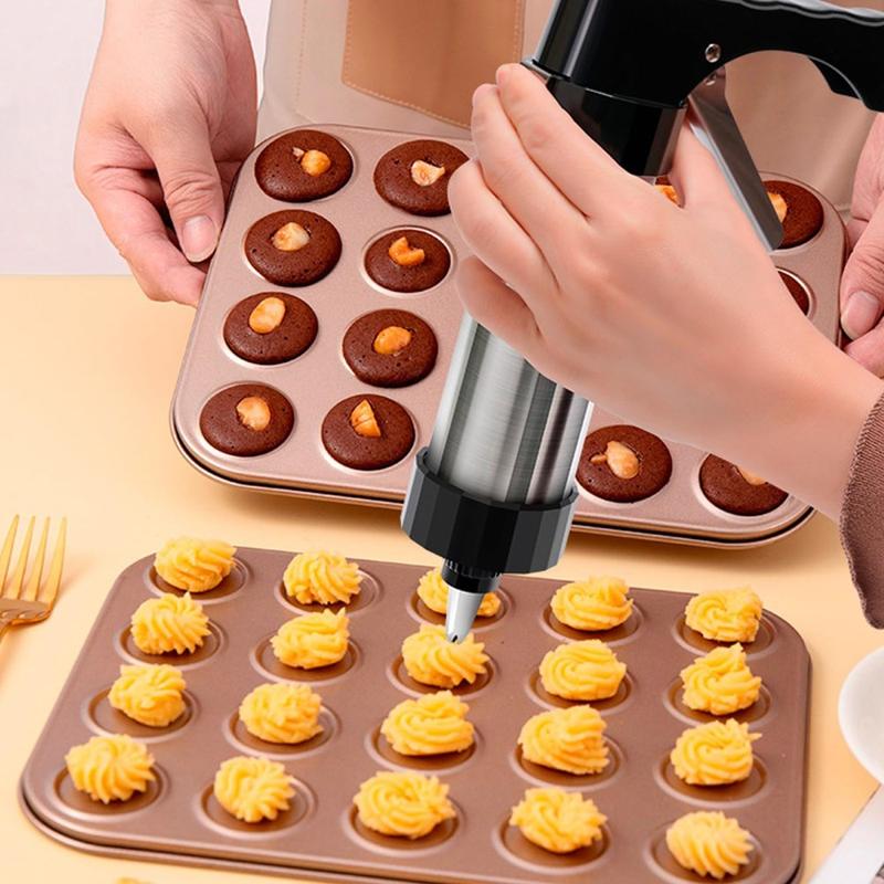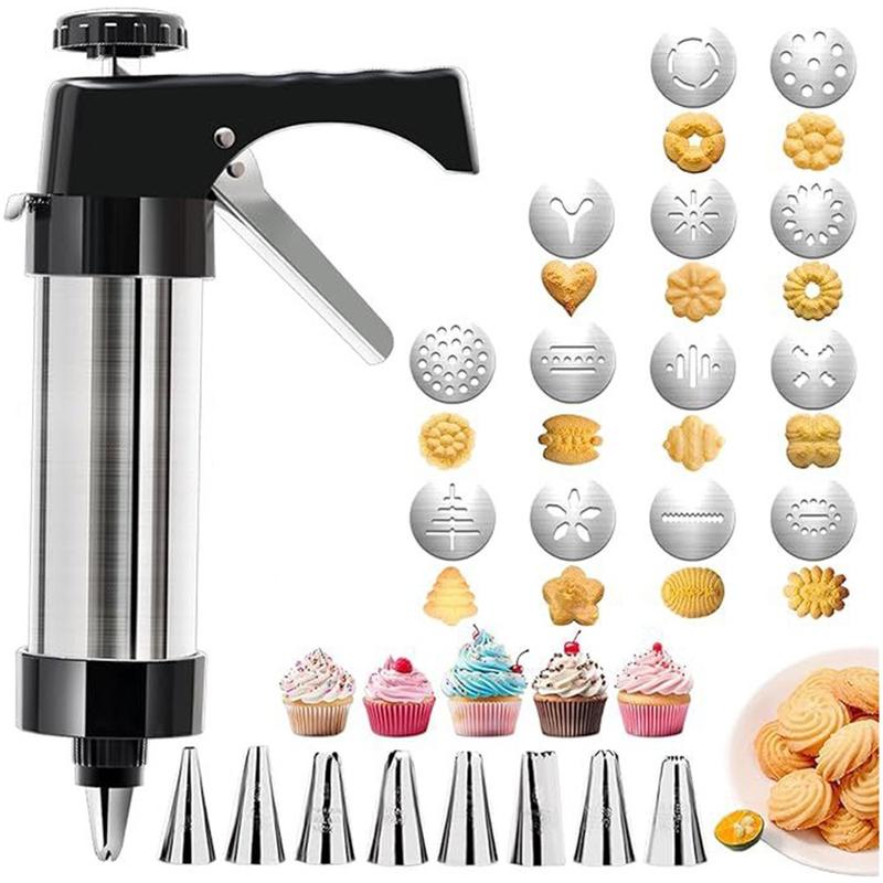 Tämä keksipuristinsarja antaa sinulle luovan vapauden ilman monimutkaisia työkaluja. Tukeva ruostumattomasta teräksestä valmistettu rakenne takaa pitkäaikaisen käytön, ja laajan kiekko- ja suutinvalikoiman ansiosta voit mukauttaa jokaisen leivonnaisen. Helppo puhdistus ja yksinkertainen käyttö tekevät siitä sopivan sekä aloittelijoille että kokeneille leipojille.