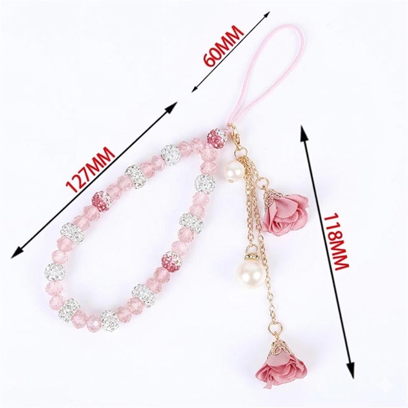 Lisää puhelimeesi tyylikäs yksityiskohta tällä 18,7 cm:n pituisella kristallikoruilla koristellulla puhelinnauhalla. Se on suunniteltu sekä koristeelliseksi asusteeksi että käytännölliseksi rannehihnaksi, ja siinä yhdistyvät kristallityyliset helmet, strassimaiset metallikoristeet, ruusukoristeet ja tekopärliriipus, jotka luovat hienostuneen ilmeen arkeen.