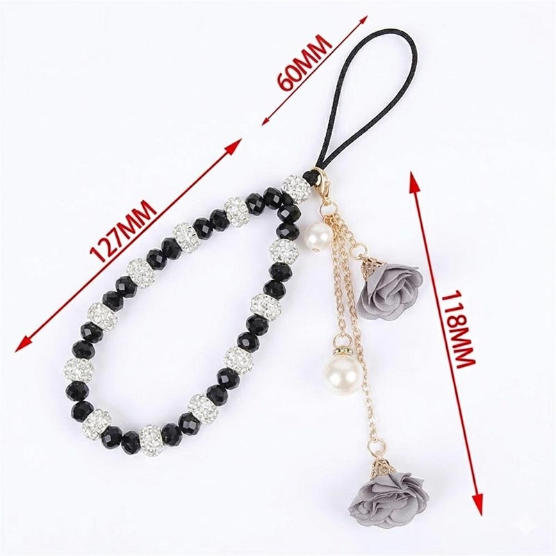 Lisää puhelimeesi tyylikäs yksityiskohta tällä 18,7 cm:n pituisella kristallikoruilla koristellulla puhelinnauhalla. Se on suunniteltu sekä koristeelliseksi asusteeksi että käytännölliseksi rannehihnaksi, ja siinä yhdistyvät kristallityyliset helmet, strassimaiset metallikoristeet, ruusukoristeet ja tekopärliriipus, jotka luovat hienostuneen ilmeen arkeen.