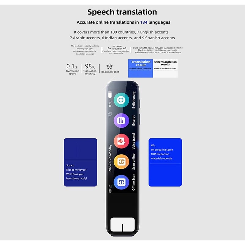 S08B on enemmän kuin kääntäjä - se on kannettava viestintäkeskus. Se kattaa valtavan kielivalikoiman ja tarjoaa sekä online- että offline-ominaisuuksia, joten se on ihanteellinen kansainvälisillä matkoilla, liiketapaamisissa ja opiskelussa. Sen kompakti koko ja monitoimiset ominaisuudet tekevät siitä monitoimiratkaisun maailmanlaajuiseen viestintään.