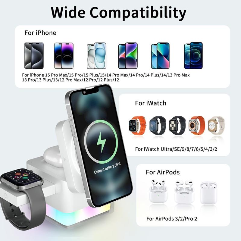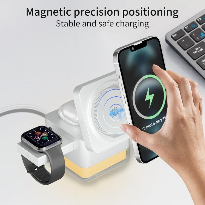 Magneettinen kohdistus auttaa pitämään yhteensopivat laitteet oikeassa asennossa vakaata latausta varten, kun taas taitettava muotoilu tekee telakasta helpon pakata laukkuun tai reppuun. Siinä on myös RGB-tunnelmavalaistus, joka lisää pehmeän koristeellisen hehkun ja voi toimia lempeänä yövalona työpöydällä tai yöpöydällä.