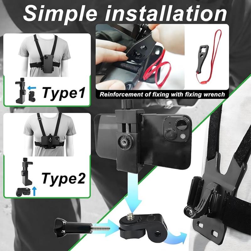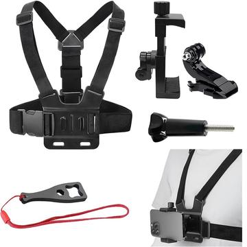 - Käyttö: Rintakehään kiinnitettävä kiinnike puhelimille ja action-kameroille