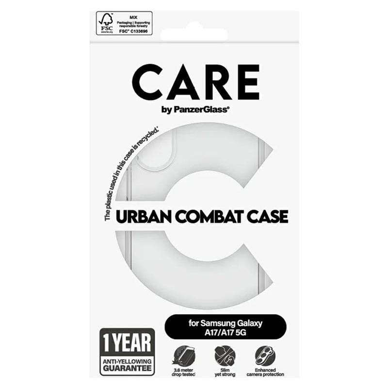CARE by PanzerGlass Flagship Case for Samsung Galaxy A17, Galaxy M17 Urban Combat with Clear Frame on suunniteltu niille, jotka tarvitsevat vankkaa suojaa tyylistä tinkimättä. Tämä 100-prosenttisesti kierrätysmuovista valmistettu kotelo kestää jopa 4,8 metrin pudotukset ja tarjoaa parannetun naarmu- ja iskunkestävyyden. Se on myös yhteensopiva langattoman latauksen kanssa ja siinä on 1 vuoden kellastumisenestotakuu.