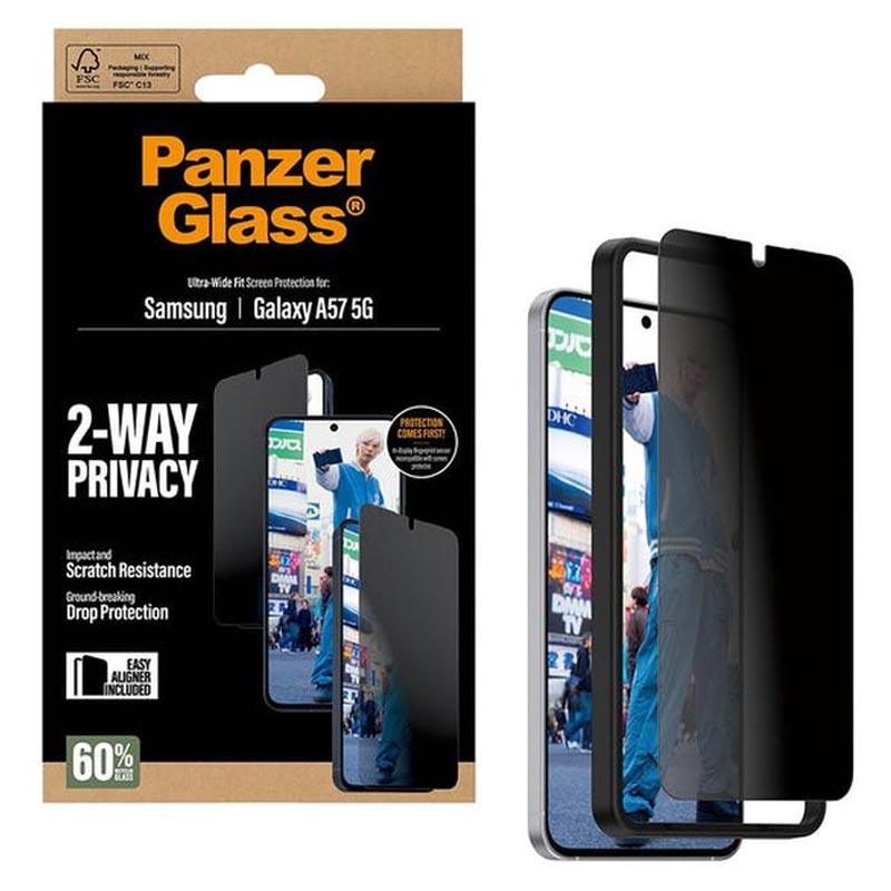 Sano hyvästit uteliaille katseille ja tervetuloa mielenrauhaan - PanzerGlass Ultra-Wide Fit Privacy -karkaistu lasi EasyAlignerilla Samsung Galaxy A57ille pitää yksityiset viestisi tai pankkitietosi turvassa. Se tarjoaa myös lyömättömän suojan naarmuja, sattumanvaraisia törmäyksiä ja sormenjälkiä vastaan PanzerGlassin kehittämän timanttitason karkaistun lasin ansiosta.
