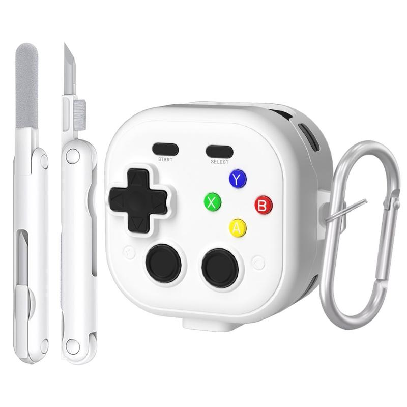 Peliohjaimen tyylinen kotelo, jossa on karabiinihaka ja puhdistustyökalu, Samsung Galaxy Buds 4:lle ja Galaxy Buds 4 Pro:lle
