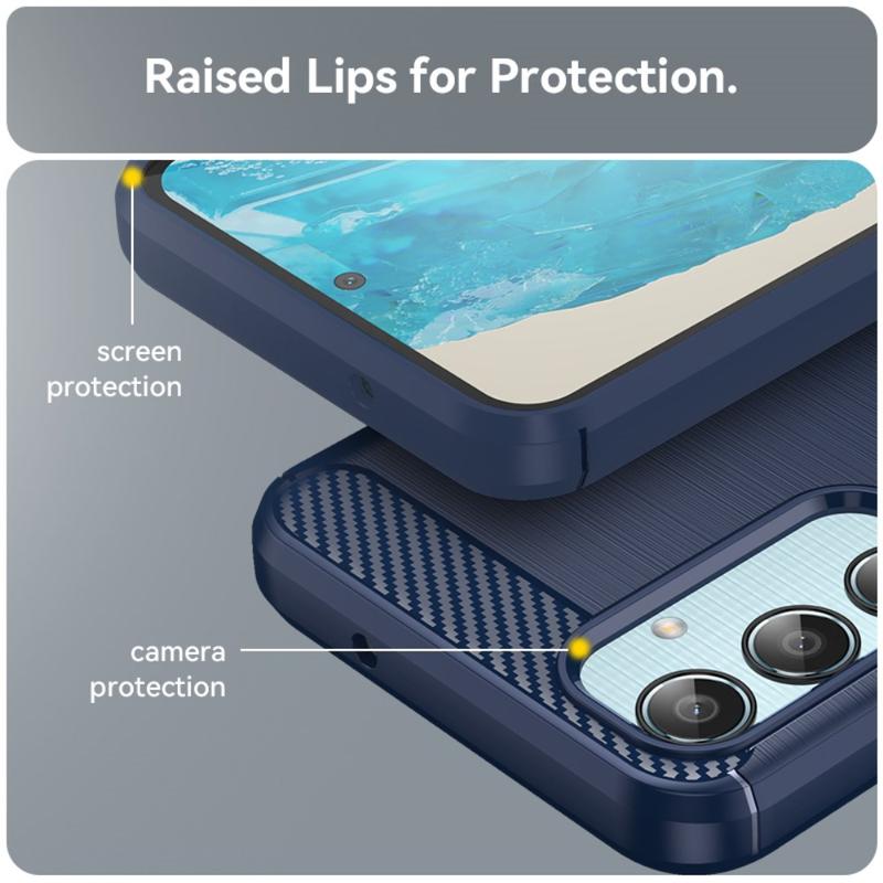 Harjattu TPU-kotelo suojaa Samsung Galaxy M35:saa riittävästi ja antaa sille upean tyylin takaosan hiilikuitukuvionsa ansiosta. Kotelo varmistaa myös lämmön haihtumisen käytettäessä Samsung Galaxy M35 -puhelinta sen lämpöä hajottavan rakenteensa ansiosta.