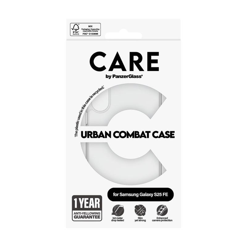 CARE by PanzerGlass Flagship Case for Samsung Galaxy S25 FE Urban Combat with Clear Frame on suunniteltu niille, jotka tarvitsevat vankkaa suojaa tyylistä tinkimättä. Tämä 100-prosenttisesti kierrätysmuovista valmistettu kotelo kestää jopa 4,8 metrin pudotukset ja tarjoaa parannetun naarmu- ja iskunkestävyyden. Se on myös yhteensopiva langattoman latauksen kanssa ja siinä on 1 vuoden kellastumisenestotakuu.