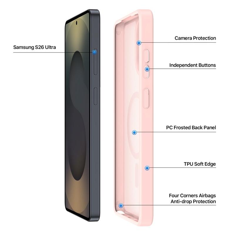 - Suojaa Samsung Galaxy S26 Ultra kuntosalilla; TPU-ilmatyynyt pehmentävät penkkien tai käsipainojen aiheuttamia iskuja.