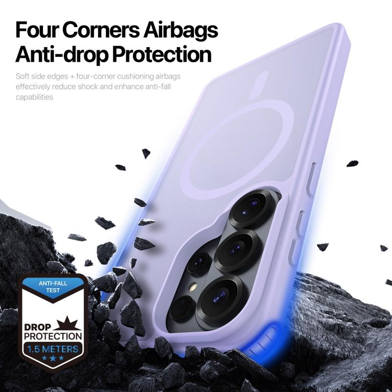 - Hybridirakenne: matta polykarbonaattirunko + joustava TPU-puskuri, jossa on kulmien ilmatyynyt iskunvaimennusta varten.