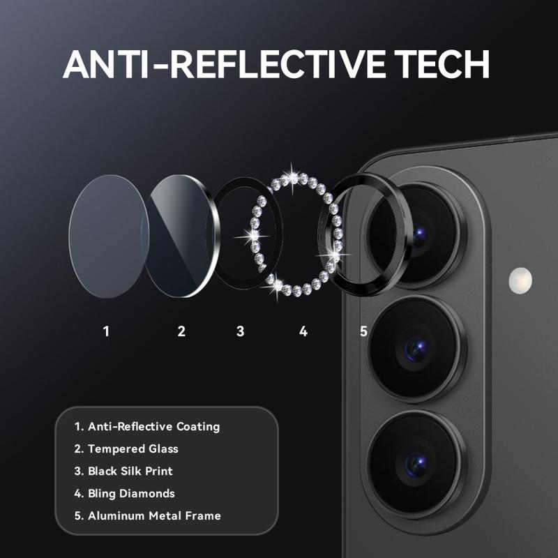 NORTHJO Rhinestone Lens Protector tarjoaa molempien maailmojen parhaat puolet - ensiluokkaista kimallusta ja lujaa kestävyyttä. Se parantaa puhelimesi ulkonäköä säilyttäen samalla ammattimaisen valokuvakirkkauden ja jokapäiväisen suojan.