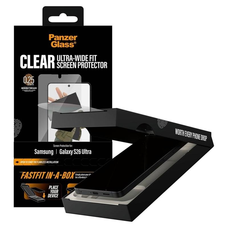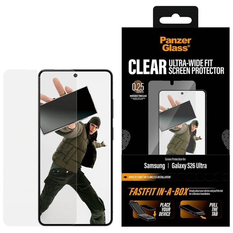 PanzerGlass Ultra-Wide Fit -näytönsuoja Samsung Galaxy S26 Ultra -puhelimelle on suunniteltu nopeaan ja kuplattomaan asennukseen innovatiivisen FASTFIT IN-A-BOX -järjestelmän ansiosta. Aseta vain Samsung Galaxy S26 Ultra -puhelin kuvapuoli ylöspäin, vedä kielekkeestä ja nauti täydellisesti kohdistetusta suojasta joka kerta - ei pölyä, ei turhautumista.