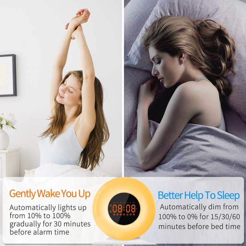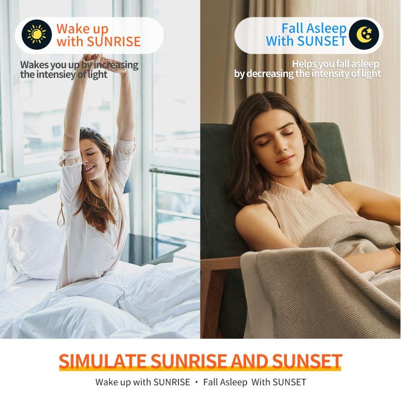- Hellävarainen herääminen: käytä auringonnousun valoa ja pehmeää herätysääntä rauhallisempien aamujen takaamiseksi
