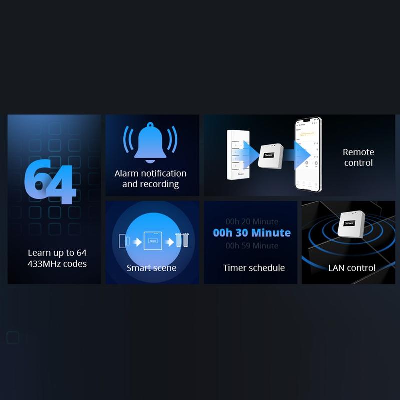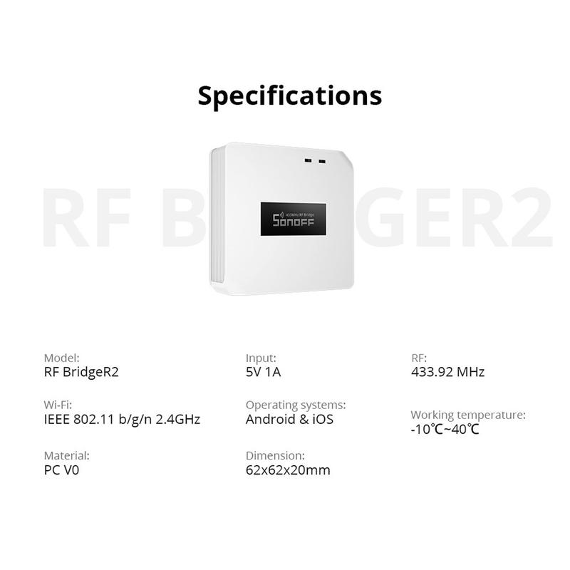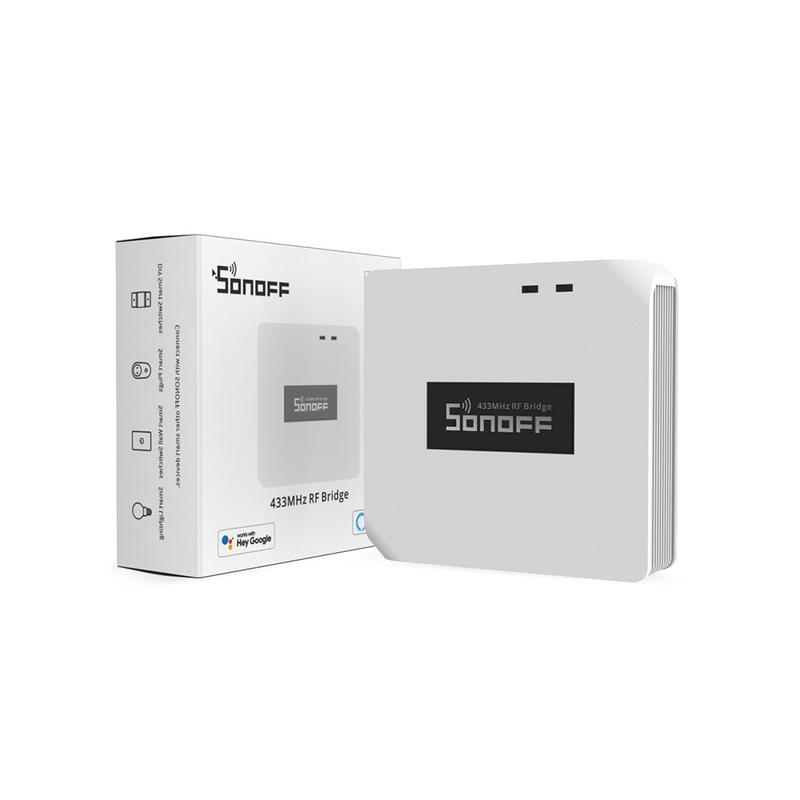 Tuo 433MHz:n RF-laitteet WiFi-älykotiisi Sonoff RF BridgeR2:n avulla. Tämä kompakti älykeskus toimii siltana RF 433,92 MHz:n anturien ja kaukosäätimien sekä WiFi-verkon välillä, jolloin voit hallita yhteensopivia laitteita puhelimellasi eWeLink-sovelluksen kautta. Käytä sitä useiden RF-laitteiden hallinnan yksinkertaistamiseen, automaatiotilanteiden luomiseen ja ilmoitusten vastaanottamiseen turvallisuustapahtumista, kuten ovien avaamisesta tai liikkeen havaitsemisesta.