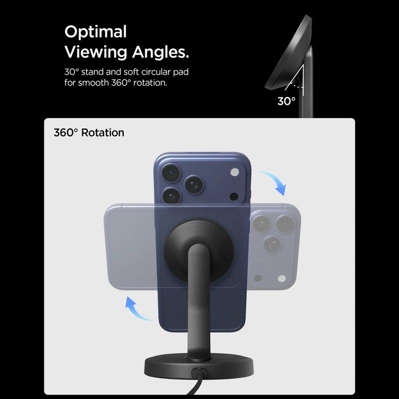 Spigen EF151MS yhdistää vahvan magneettisen kohdistuksen, mukavan katselukulman ja vakaan langattoman latauksen yhdessä kompaktissa laitteessa. Sen avulla voit ladata ja käyttää puhelinta samanaikaisesti pitämättä sitä kädessä, mikä tekee siitä käytännöllisen sekä työhön että vapaa-aikaan. Sisäänrakennetuilla turvaominaisuuksilla ja kestävällä USB-C-kaapelilla varustettuna se tarjoaa luotettavan latauksen puhtaassa, modernissa muotoilussa.