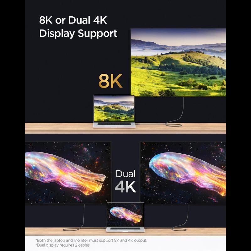 Yhteensopivuuden Thunderbolt 3:n ja 4:n kanssa ansiosta kaapeli tukee myös kehittynyttä videolähtöä - 8K (yksi näyttö) ja 4K (kaksi näyttöä) DisplayPort 2.0:n kautta. Tämän ansiosta se sopii täydellisesti kannettavien tietokoneiden tai telakointiasemien liittämiseen korkean resoluution näyttöihin.
